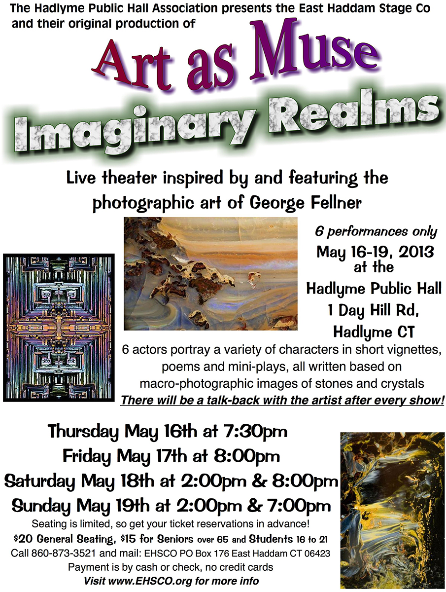 “Art as Muse: Imaginary Realms,” A series of live theatrical presentations on stage influenced by the artworks of George Fellner, East Haddam Stage Company, Hadlyme Public Hall Association; Hadlyme, CT (May 2013)